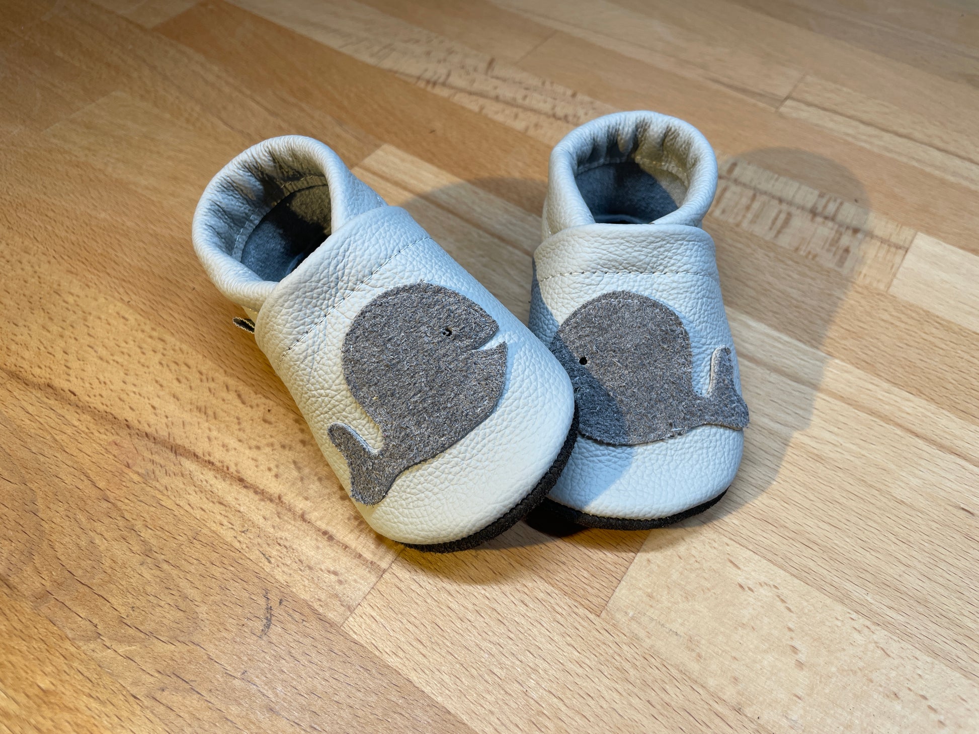 Kuschelige Wale af hellgrauen Lederpuschen.