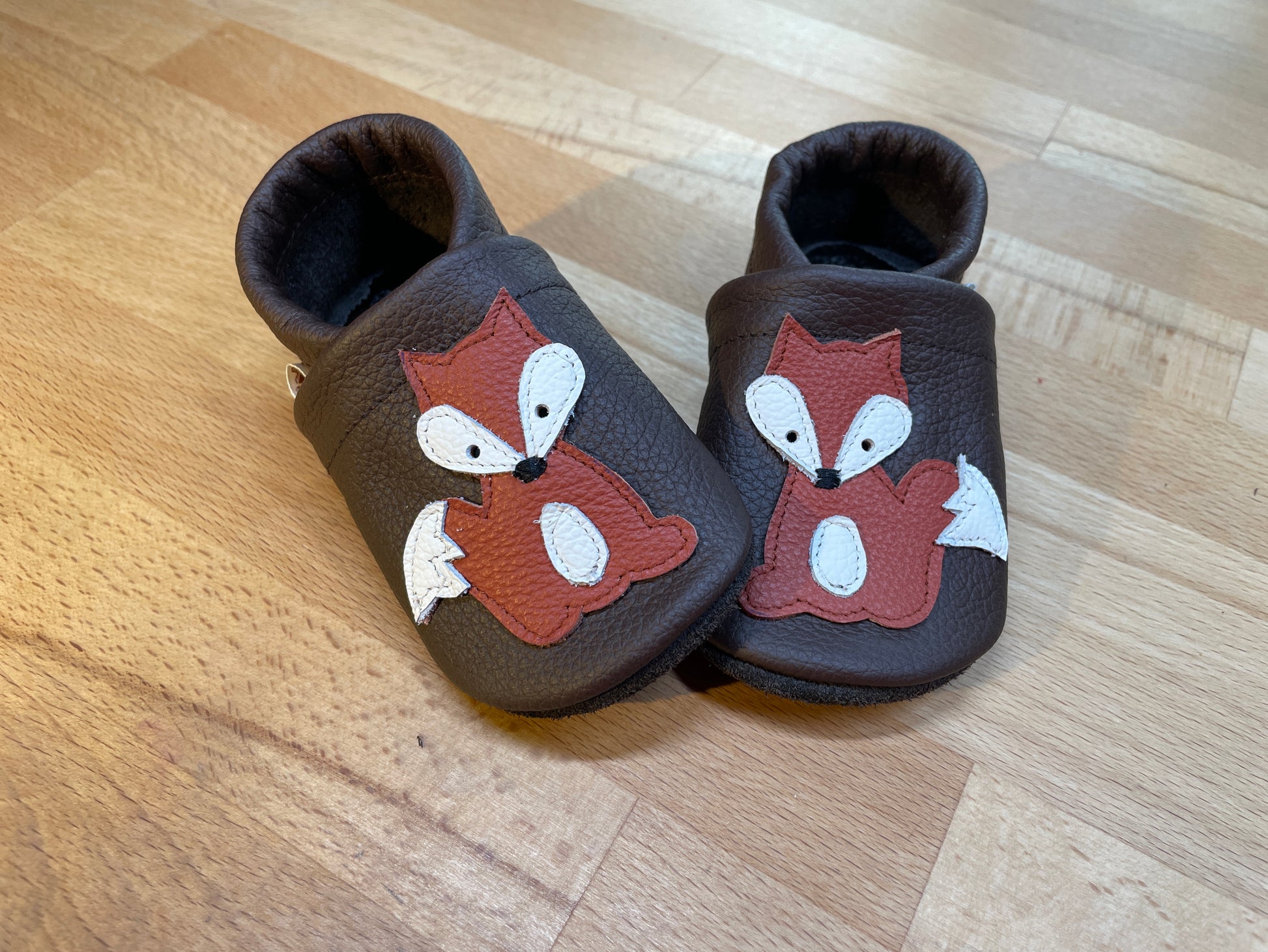 Niedliche Füchse auf dunkelbraunen Lederpuschen