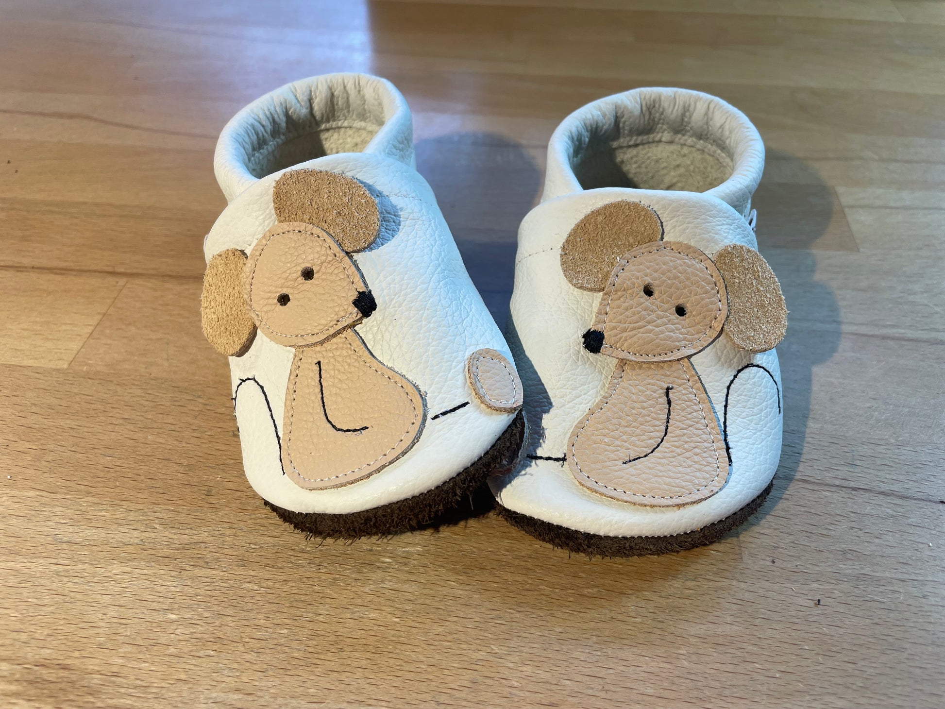 Kleine Mäuschen auf cremefarbenen Lederpuschen.