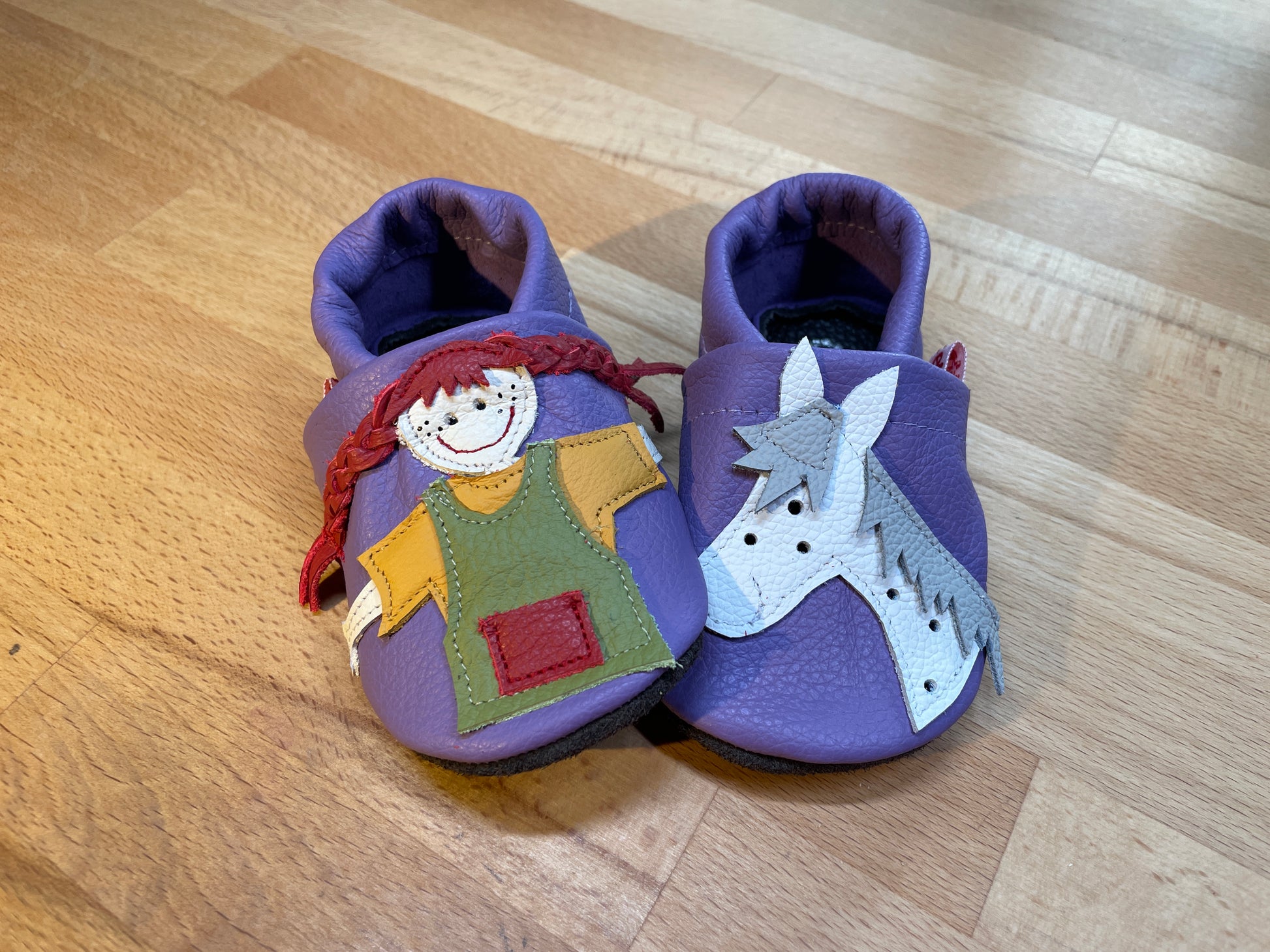 Freche Pippi + kleiner Onkel auf fliederfarebenen Lederpuschen